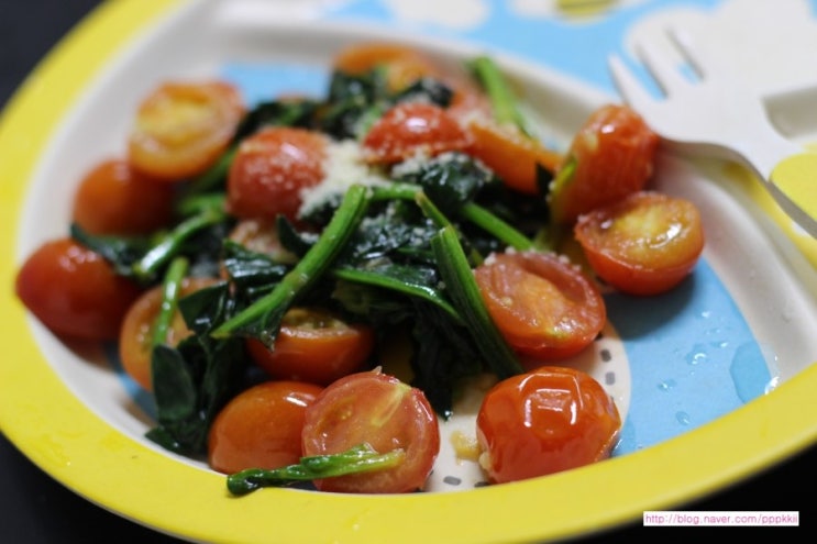 안녕하세요 룰루쩡은 집에 신선한 시금치와 방울 토마토가 있어서 간식 해주려고 아 파릇파릇 ...
