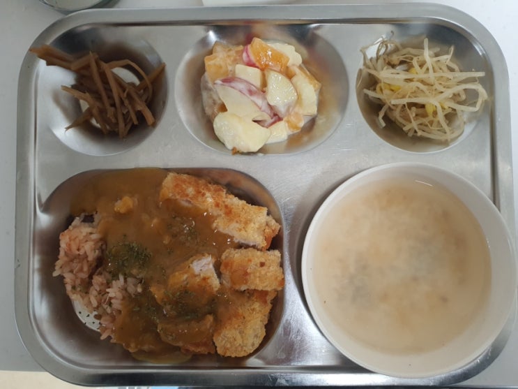 워킹맘 아이밥상 377 [돈까스카레덮밥, 누룽지, 콩나물무침, 우엉채조림, 과일샐러드] 오늘도 골고루 챙겨...