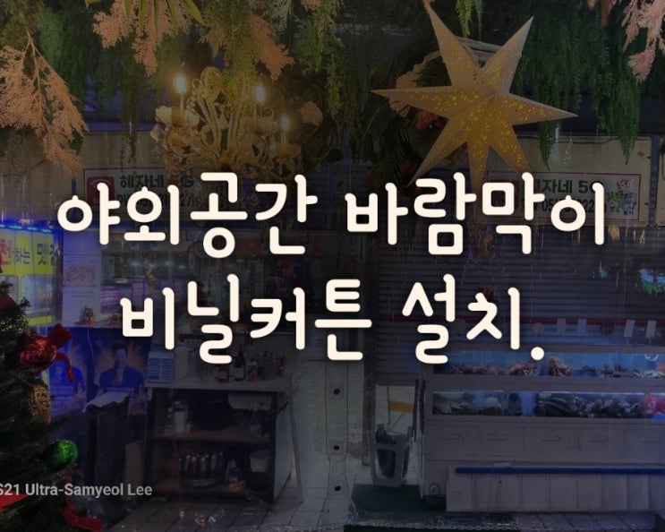 해운대시장 내 조개구이 야외테이블 바람막이용 비닐커튼 설치.