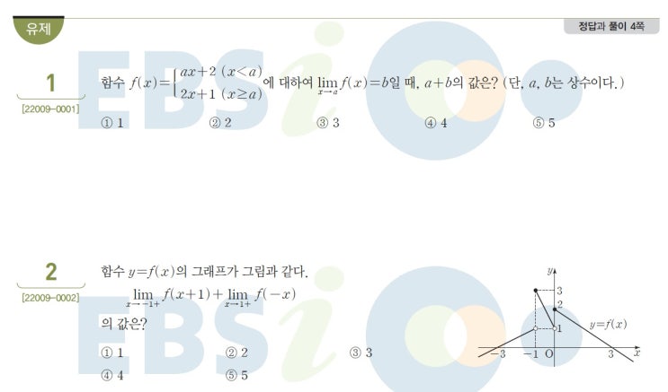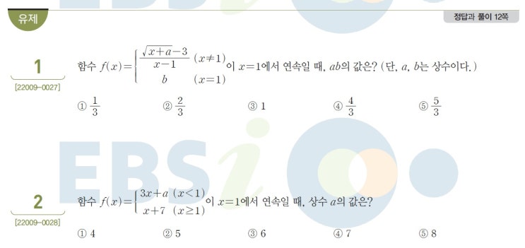 2023 수능특강 수학2 2. 함수의 연속 유제 문제 풀이입니다. 문제 1번은 x 가 1에서 연속이므로 극한값과 ...