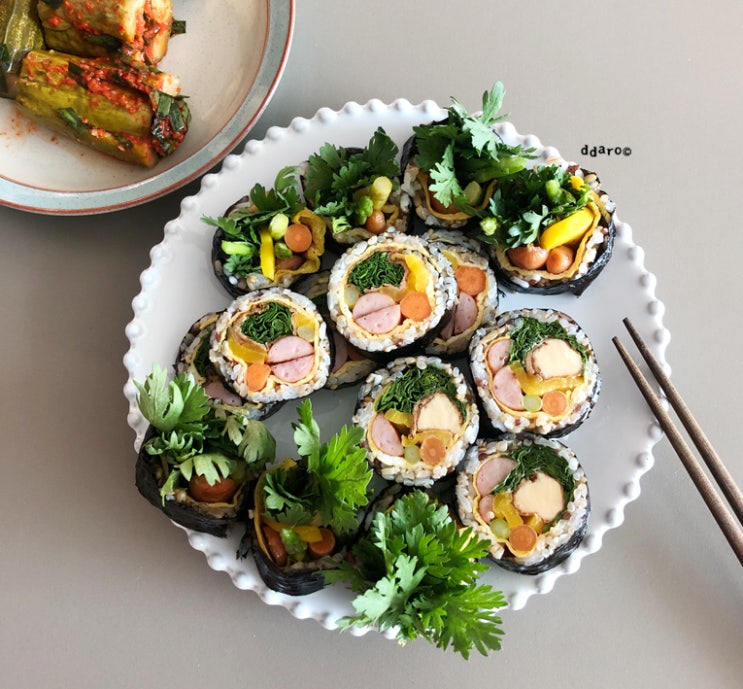 쑥갓김밥. 매력에 빠지다. 쑥갓을 많이 더 많이. 꽁지4개 나오게 김을 2등분해서 말아요. 있는 재료로만도 ...