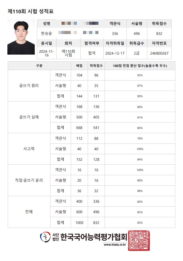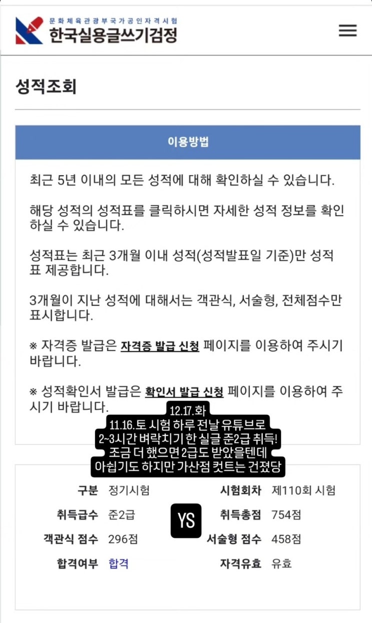 12월 17일 한국실용글쓰기 제110회 시험 실글 준2급 합격 자격증 취득 하루전날 벼락치기, 단기합격 성공 ...