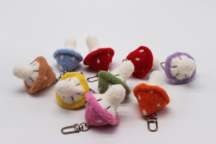 핸드메이드 머쉬룸 키링입니다. 여러가지 컬러의 색상으로 비슷한듯 모두 다른 매력으로 조화를 이루고 있...