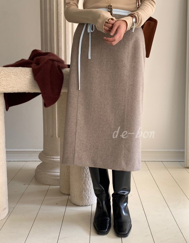 로우게이지 사틴 끈 울 스커트 H라인 미디 스커트