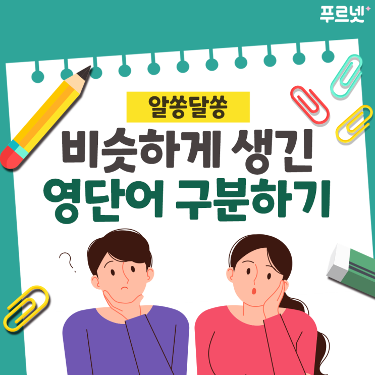 안녕하세요 창원 푸르넷 공부방입니다. 영어 단어를 공부하다 보면 발음이나 스펠링이 매우 비슷한 단어들...