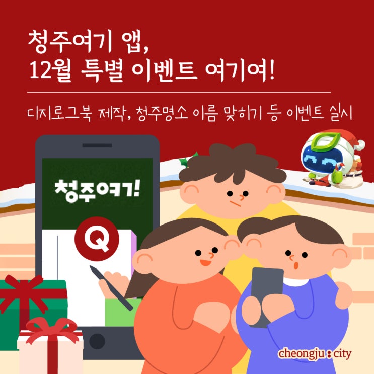 여기여! 청주여기 앱에서 12월 특별 이벤트 한데여! 하나! ~12월 22일까지 청주관광지 이름 맞히면 1등 노...
