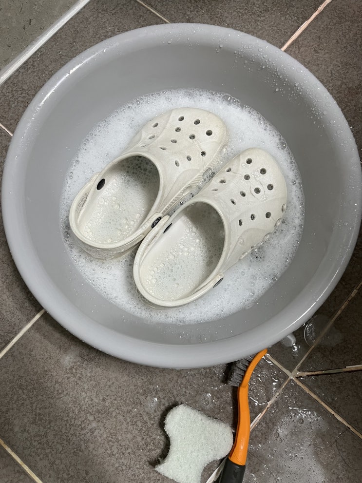 크록스 매장에서 지비츠 산 기념으로 빨래 미지근한 물에 중성세제 넣으면 된다 하얀 크록스는 표백을 위해...