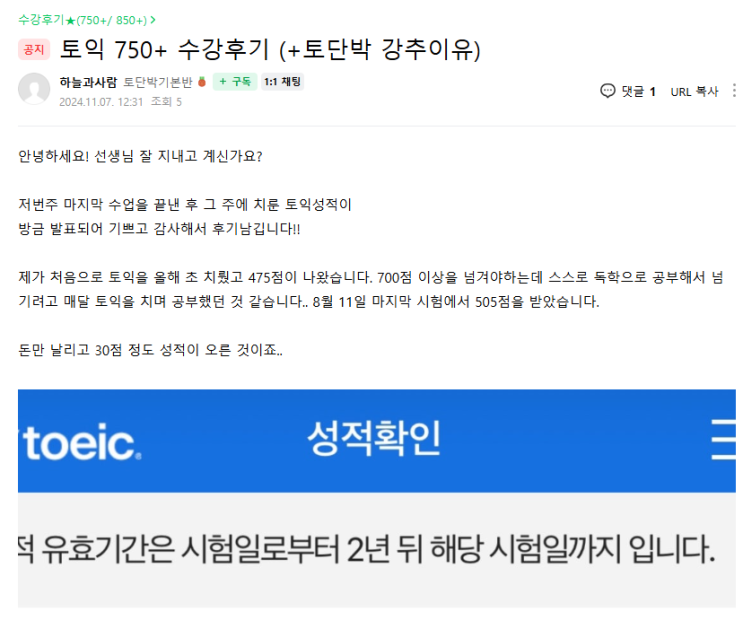 인천토익학원 감사하게도 1달 투자해서 졸업한 놀라운 토익수업