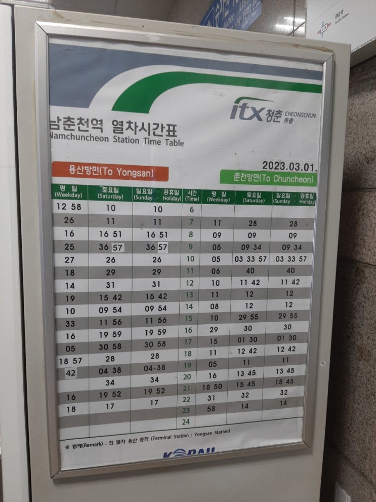 남춘천역 경춘선 수도권 전철 및 ITX 청춘 시간표(2023.03.05)