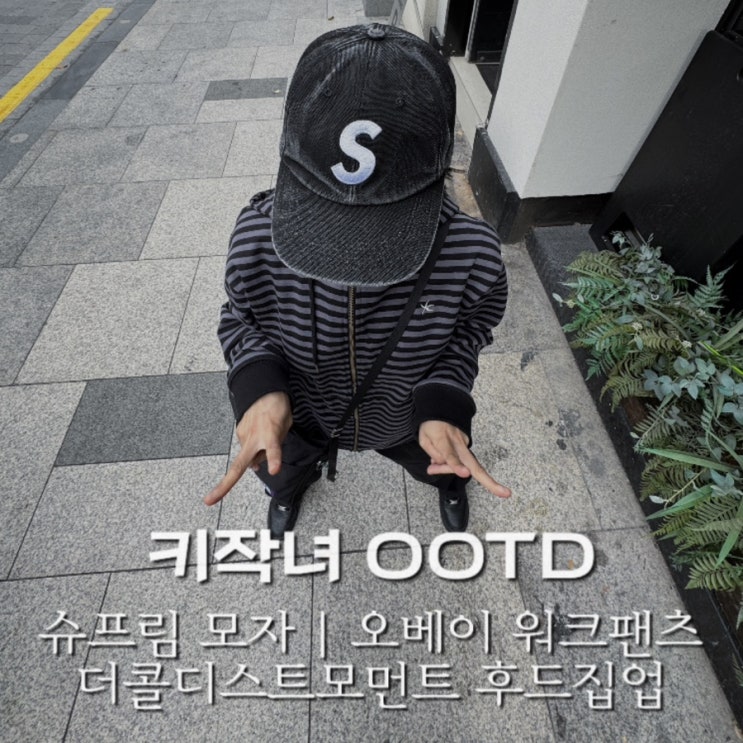 키작녀 OOTD 오베이 워크팬츠 더콜디스트모먼트 후드집업 슈프림 S로고 모자 누가 제 옷정보좀 올려달...