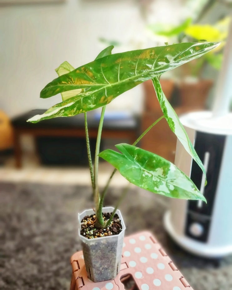 알로카시아 롱기로바 화이트 바리에가타 갑자기 뻥튀기가 되었다. 대략 35cm. 하지만 무늬는 한참 퇴보. 직...