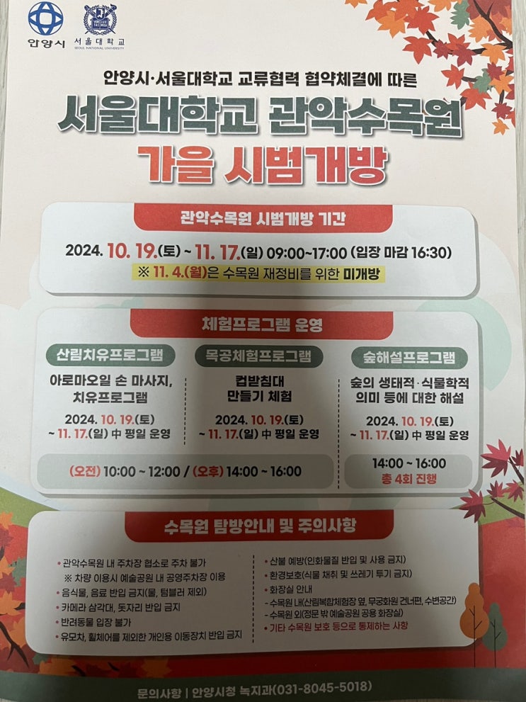 서울대학교 관악수목원 가을 시범 개방. 2024.10.19~11.17