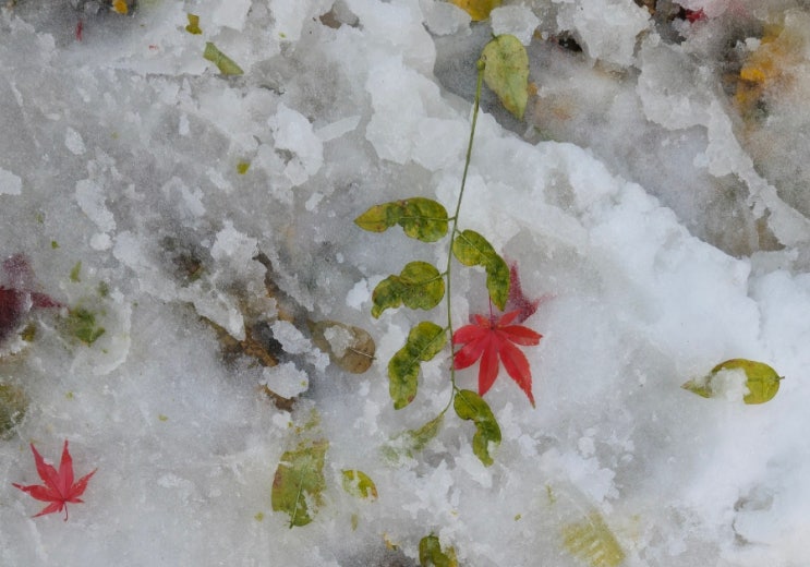 갑작스레 눈이 소복. 가을과 겨울이 공존