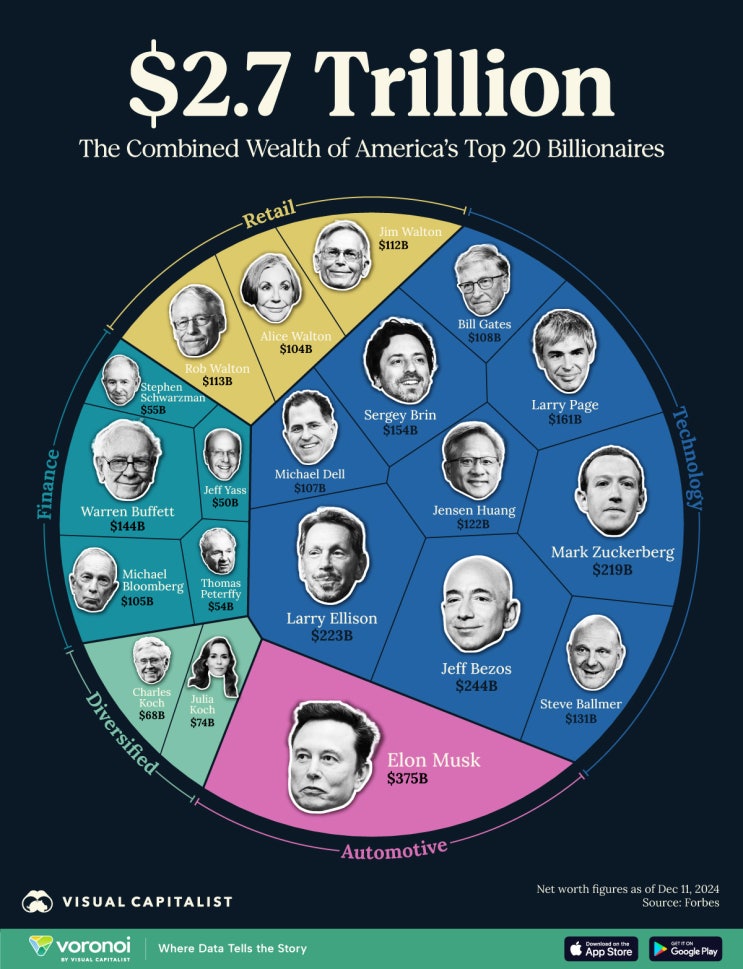 2.7조 달러의 부를 움직이는 사람들, 그들의 산업과 영향력 미국의 상위 20명 억만장자들이 보유한 총자산...