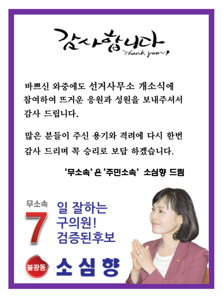 안녕하세요. 불광동 구의원으로 출마한 소심향 낙선 인사 드립니다. 무소속으로 나왔음에도 불구하고 지지...