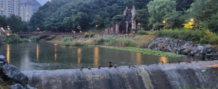 주말 밤, 비가 내리는 듯 해도 우산 쓰고 뉴타운 생태하천으로 산책 겸 운동을 나섰다. 비내리는 정경에 어...