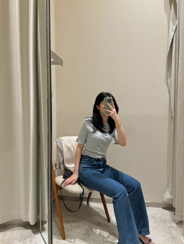 시에 SIE | 버킨 세미 부츠컷 데님, 케이시 하프 슬리브 니트(파우더 블루)