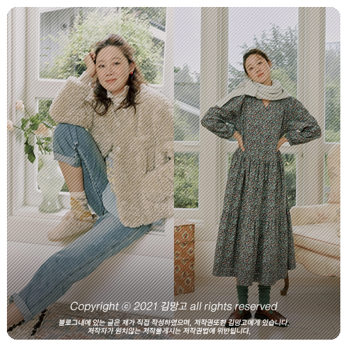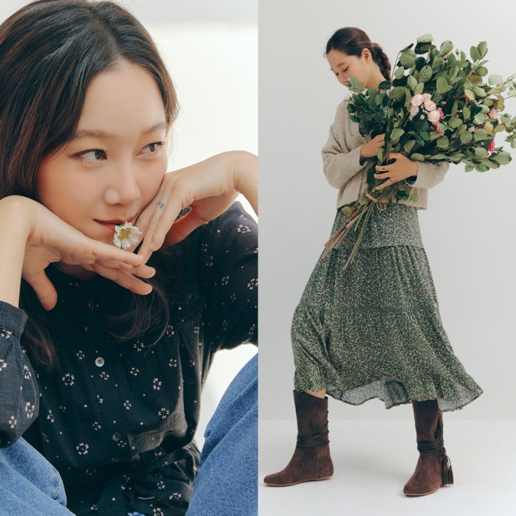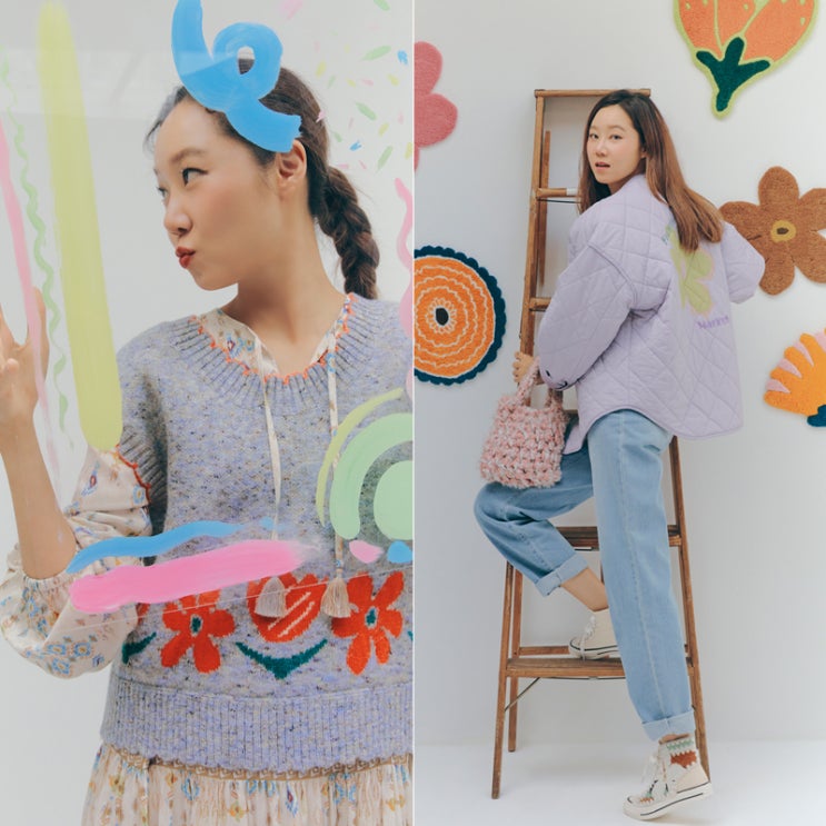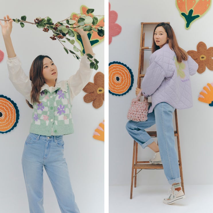 써스데이 아일랜드 X 미수아바흐브 공효진 화보 패션 속 모자, 여자 가을 니트 베스트, 플라워 가디건 코디