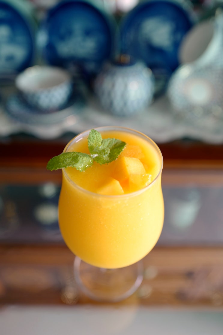 메론 메로나 우유 믹서로 돌리고 메론을 깍뚝 썰어 가니쉬로 올린다 조금 더 단맛을 원한다면 메론 시럽 20...