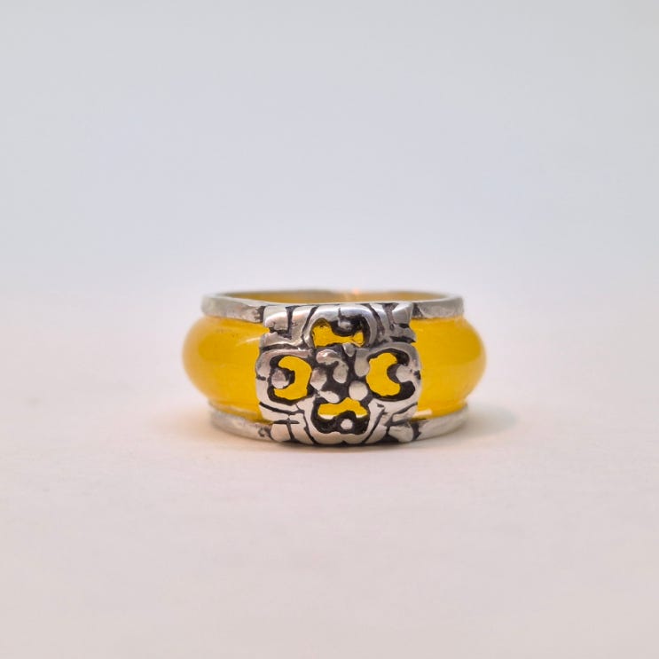 재질: 약 99%은, 옥 <<새로운 느낌을 주는 노랑 옥 은테 반지입니다. 짙은 노랑빛 옥으로 마치 호박...