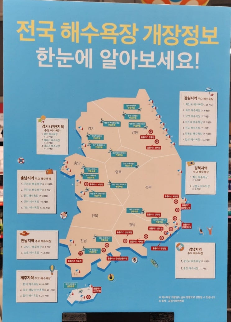 좀 늦은감이 있지만... 전국 해수욕장 개장정보다. 장마가 길어지면서 해수욕장이 울상인거 같은데... 이 ...