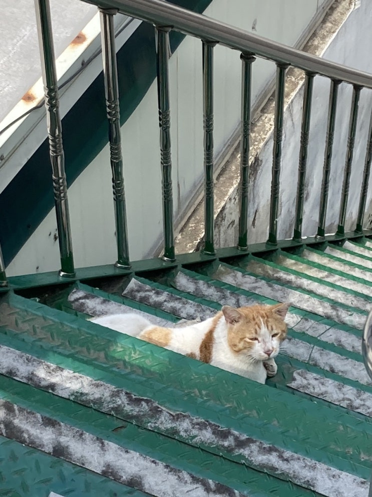 아침에 집근처에서 치즈냥 발견. 계단에 자리잡고 눈을 꿈벅꿈벅 햇빛을 쬐고 졸고 있었다. 귀엽..❤️