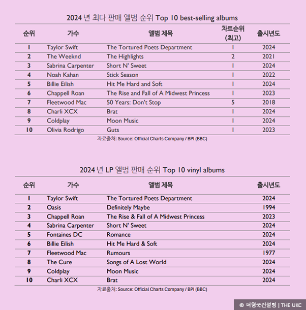 [음악] 영국, 2024년 앨범 판매순위 테일러 스위프트가 앞도한 2024년 음반 소비규모 영국 작년 한해, 4조 ...