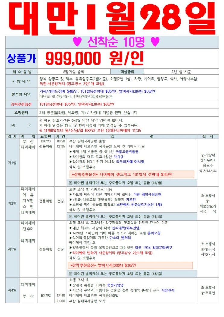 ❤대만 1월 28일 단하루 특가 ❤ 단 10석만 진행 합니다!!! 1월 28일 999,000원/인 ✅에어부산 으로 3박 4...