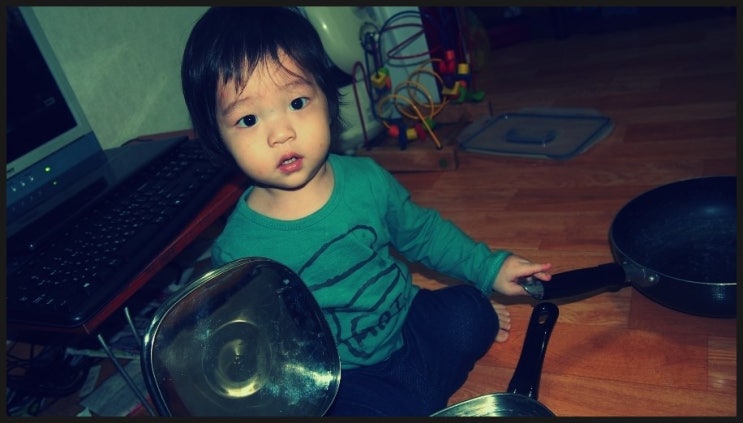 언제 컸는지 돌아다니며 냄비랑 같이 노는 녀석~~ 사실 엄만 우리 아들이랑 재미있게 살고 싶은데...