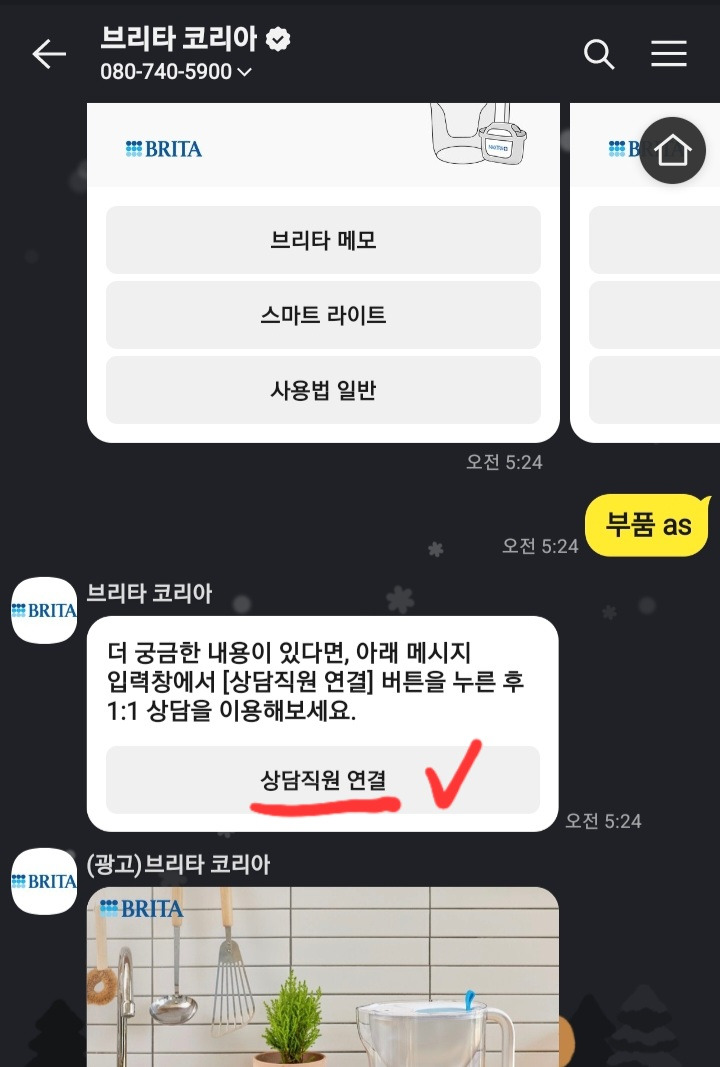 브리타(BRITA) 정수기 AS받기(부품 구매)브리타(BRITA) 정수기 AS 는 전화를 해도 되지만브리타코리아 카카오톡 채널이 있어 카카오톡으로 쉽게 할 수 있다.카카오톡 브리타코리아 채널 : http://pf.