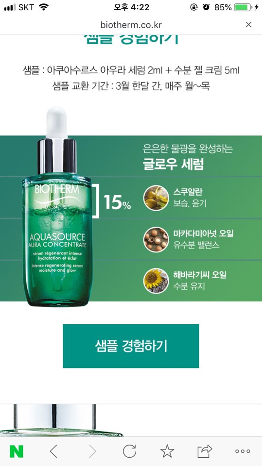 [화장품샘플]비오템 아쿠아수르스 아우라 세럼 & 수분젤 크림 샘플신청(~3/31)