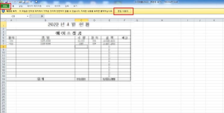 엑셀 제한된 보기 편집 사용 해제 방법