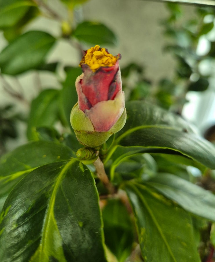 꽃을 활짝 피지 못하고 시들어가는 것 같은 유원 동백 꽃봉오리 혹시 그늘에 두어서 그럴까? 햇볕 들어오는...