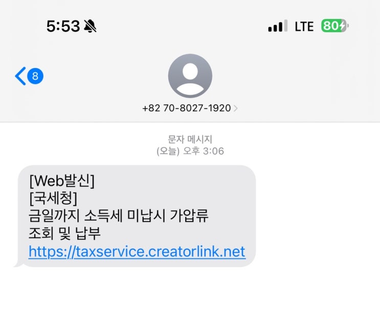[Web발신] [국세청] 금일까지 소득세 미납시 가압류 조회 및 납부 https://taxservice.creatorlink.net 뜬...
