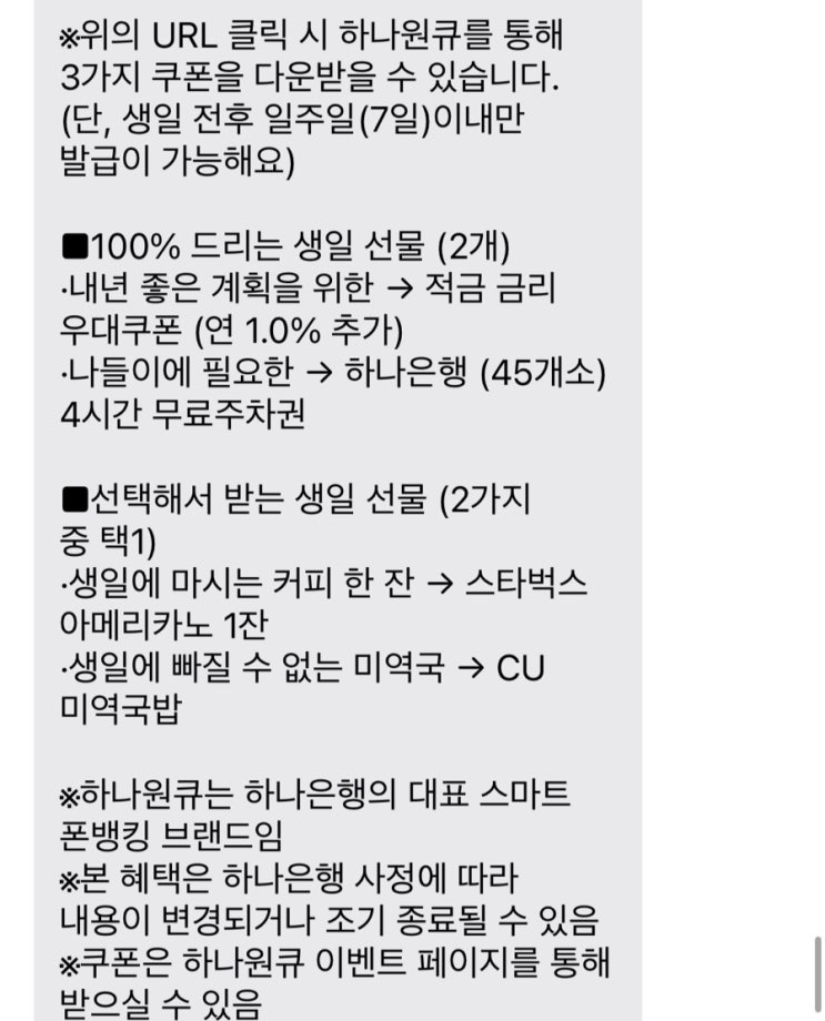 얼마 전에 제 생일이 있었는데 하나은행에서 문자가 왔더라구요! 생일 축하 겸 쿠폰 선물 문자였어요^^ 우...