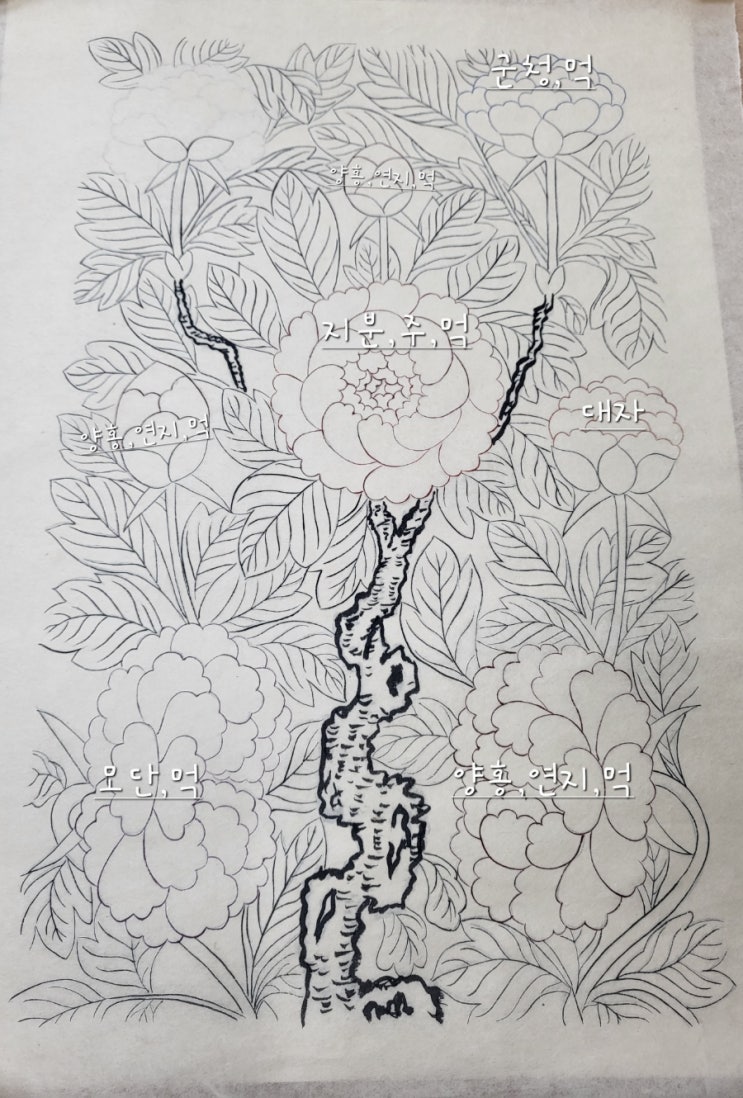 모란 꽃 테두리는 흐린 먹선이 아닌 꽃색 보다 살짝 어둡고 진하게 테두리 따기로 (먹을 탄다고 탁해지지 ...