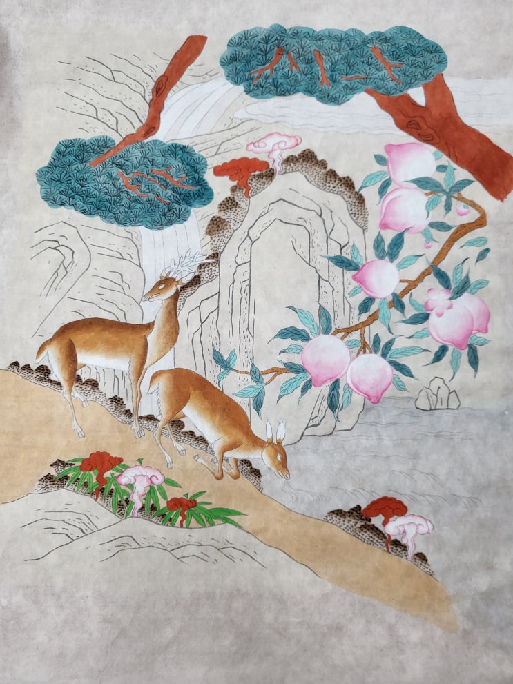 #민화분채# 장생도에서 바위는 분채로 칠해보았다 물론 색은 샘이 만들어 주심^^ 바위 구간을 나눠서 칠하...