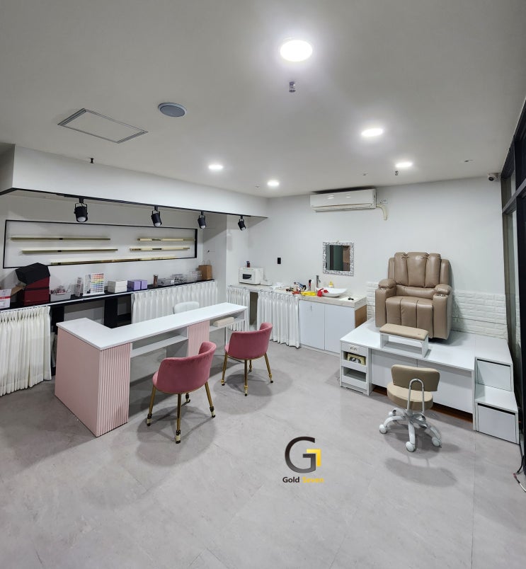 시흥 네일샵 골드세븐 네일가구 설치현장(ㄱ자2인 핑크 템바테이블+테이블의자+건식패디세트+2단계단+컬러선반 골드)