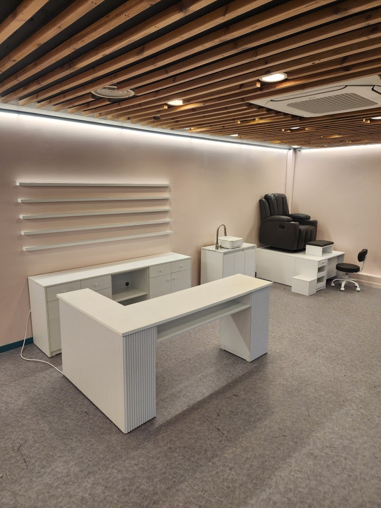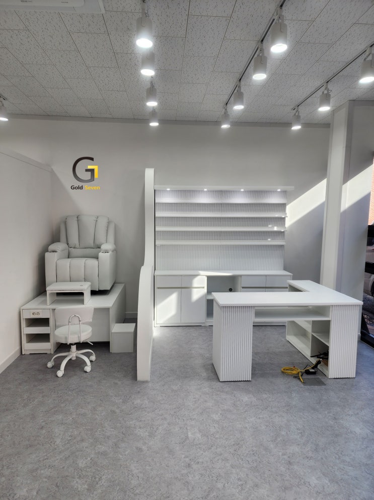 청주 네일샵 골드세븐 네일가구 설치현장(ㄱ자2인네일테이블 카운터연장+테이블용시술의자+건식패디세트+템바하부장선반세트)