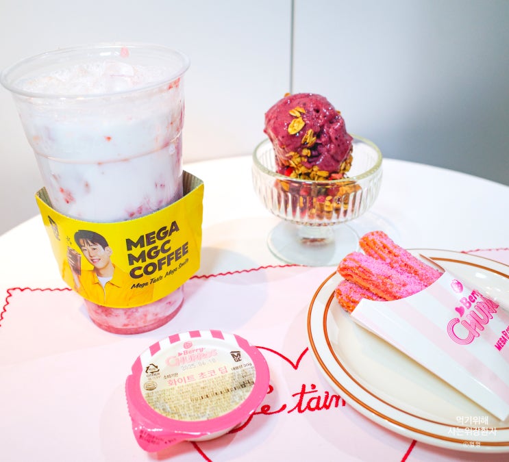메가커피 시즌 메뉴 딸기 젤라또 퐁당 프라페 딸기 요정 핑크 츄러스 세트