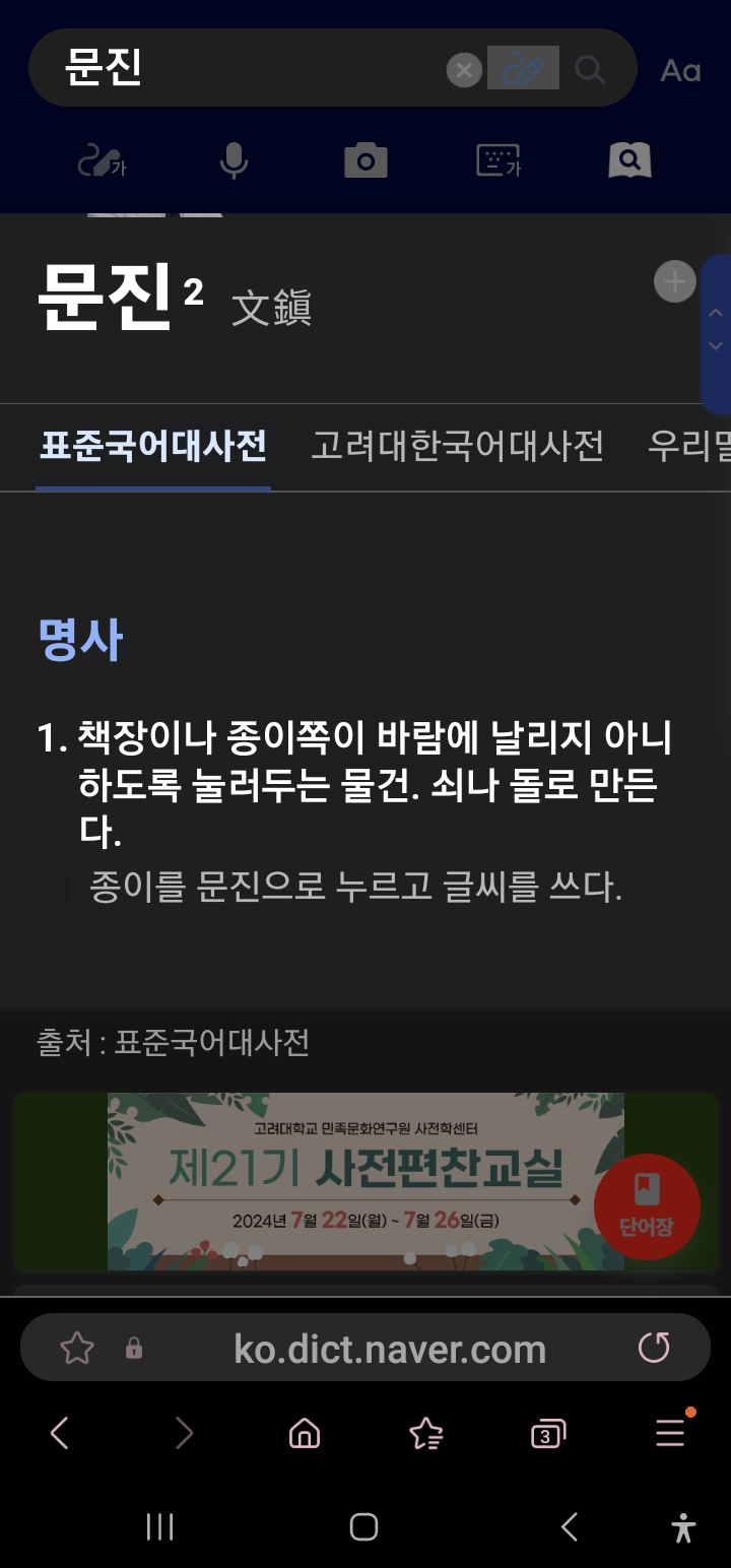 책장이나 종이쪽이 바람에 날리지 아니하도록 눌러두는 물건. 쇠나 돌로 만든다. 종이를 문진으로 누르고 ...