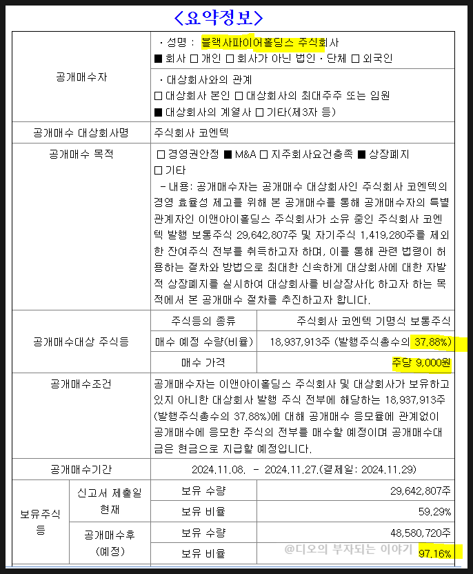 코엔텍 상장폐지 목적으로 공개매수 공시