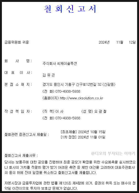 공모주 상장 철회 씨케이솔루션이 상장 철회 신고서를 제출했다. 급랭한 공모주 분위기로 인해 회사 가치를...