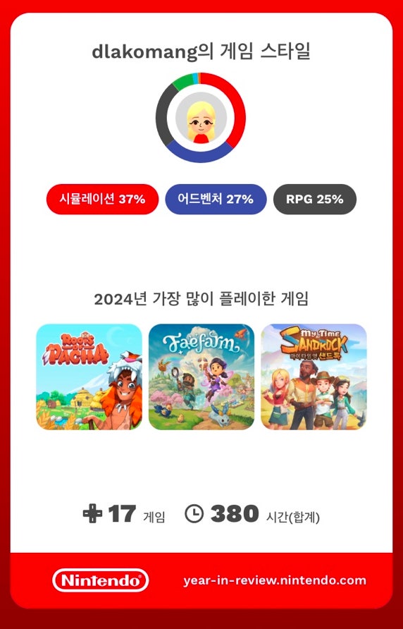 닌텐도에서 올해 내가 얼마나 게임을 했는지 친절하게 정리해줬다. 17개의 게임을 했고 380시간을 플레이했...