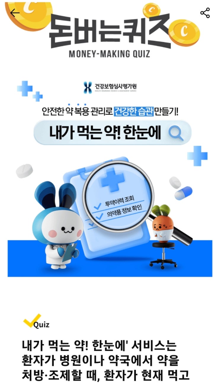내가 먹는 약! 캐시워크 돈버는 퀴즈 정답 내가 먹는 약! 한눈에 서비스는 환자가 병원이나 약국에서 약을 ...