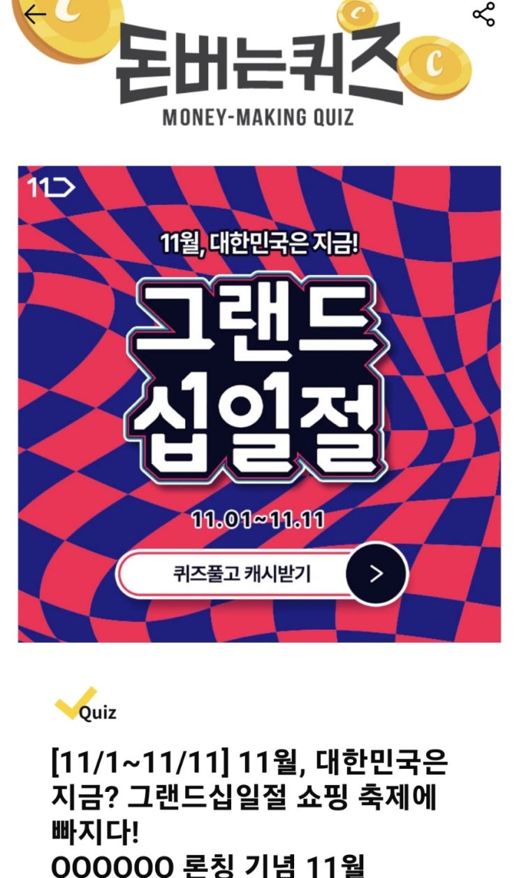 그랜드 십일절 11번가 000000 캐시워크 돈버는 퀴즈정답