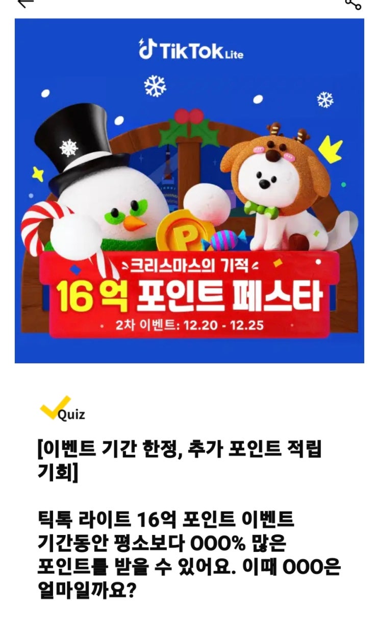 틱톡 라이트 000% 캐시워크 돈버는 (용돈)퀴즈 정답 틱톡 라이트 16억 포인트 이벤트 기간동안 평소보다 00...