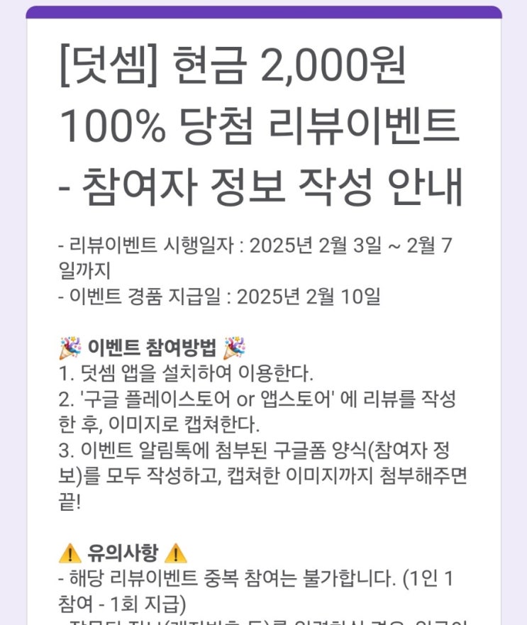 [덧셈] 현금 2,000원 100% 당첨 리뷰이벤트 - 참여자 정보 작성 안내 - 리뷰이벤트 시행일자 : 2025년 2월 ...
