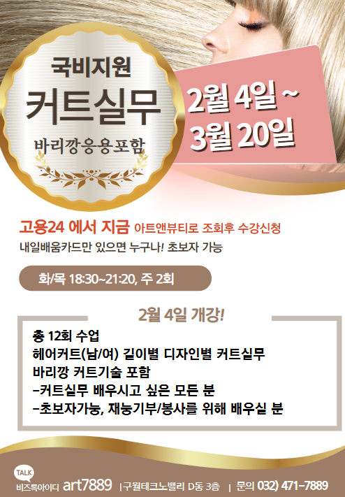 놓치면 안되는 귀한~ 국비 커트실무(바리깡포함) 수강료 지원 으로! 2/4개강! 저녁반 총 12번으로~ 인천 구월동 헤어미용학원