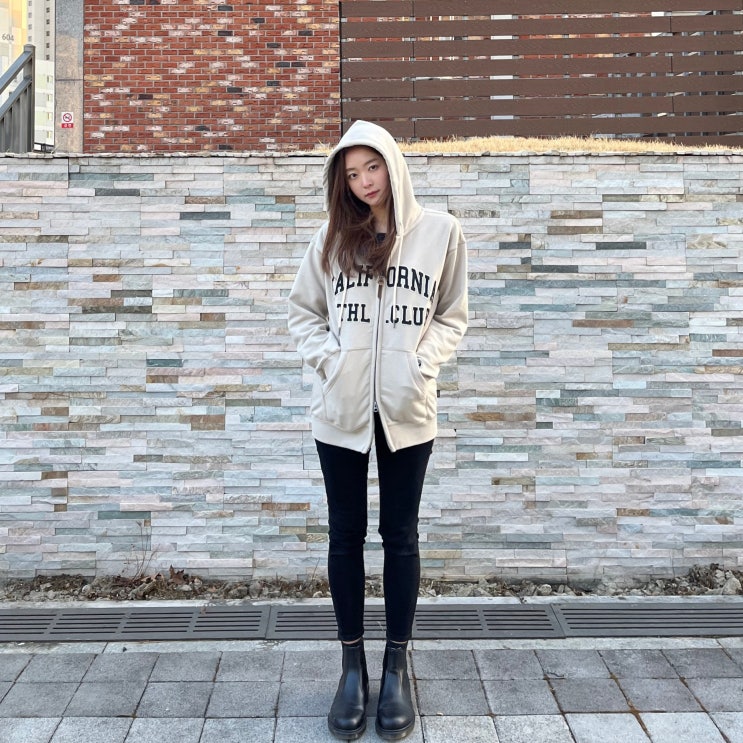 후아유 시그니처 패치 후드집업 베이지 S 여자 착용컷, 데일리룩
